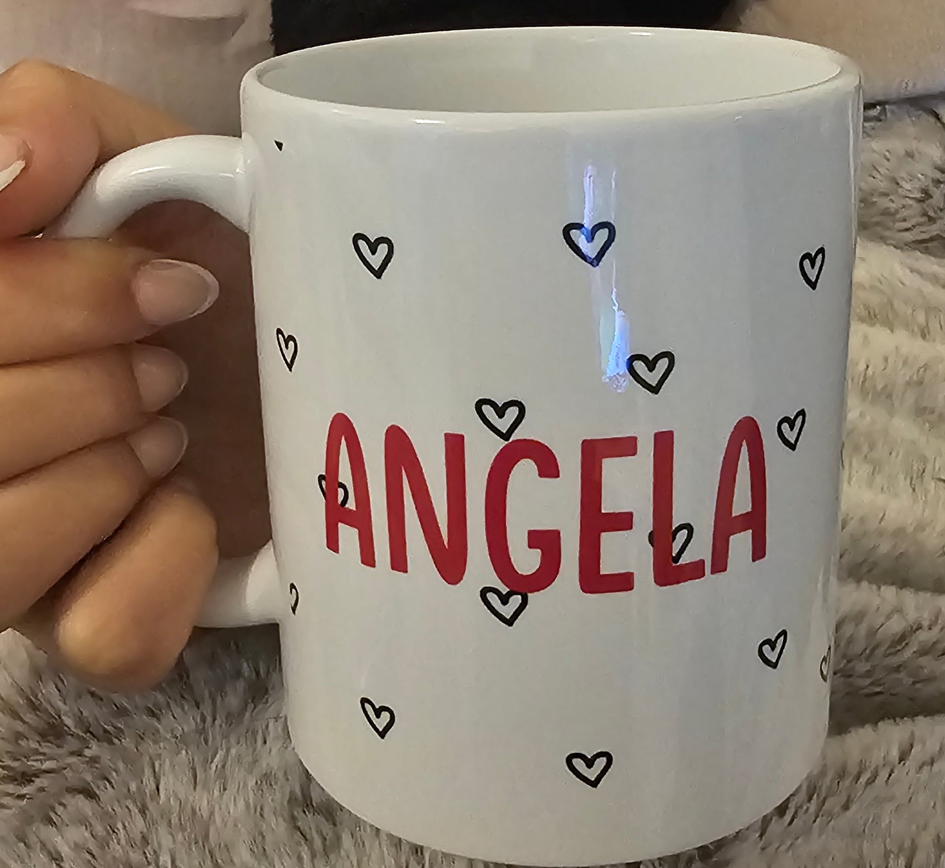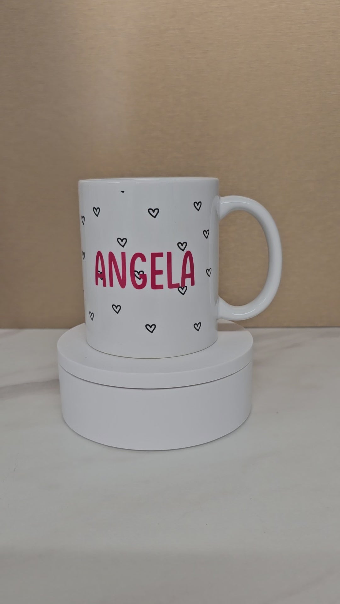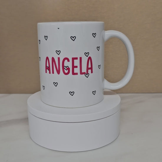 Share love and warmth with our personalised ceramic mugs featuring a sweet heart pattern and the name of your choice.