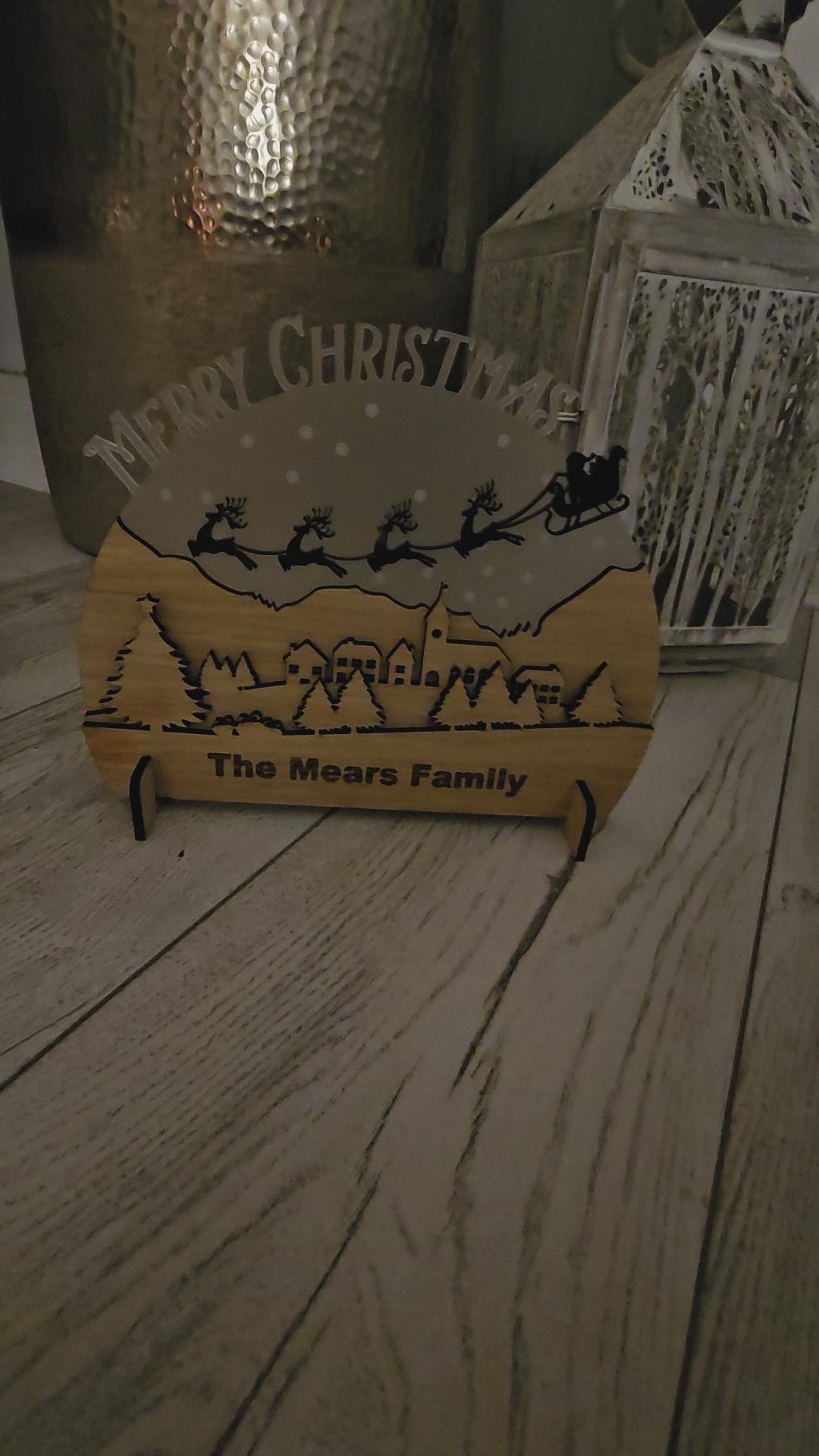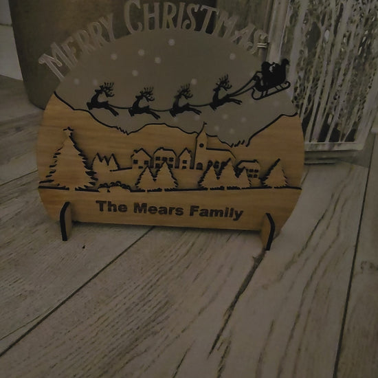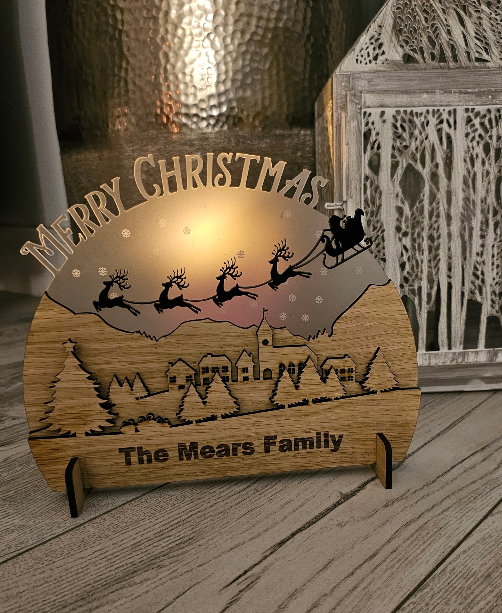 The design features the iconic Santa Claus and his reindeers, elegantly adhered to the acrylic backing, creating a charming, layered effect.